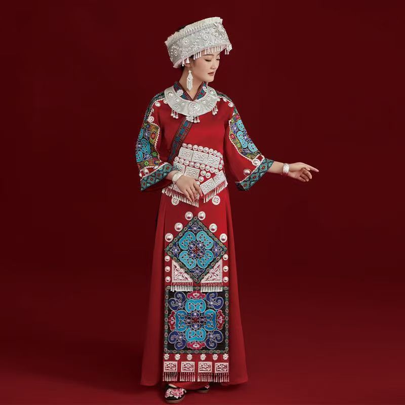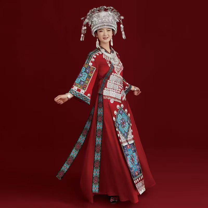 鲜艳夺目、气势磅礴、充满喜悦——这件深红色的服饰是对苗族节日和新生精神的致敬。